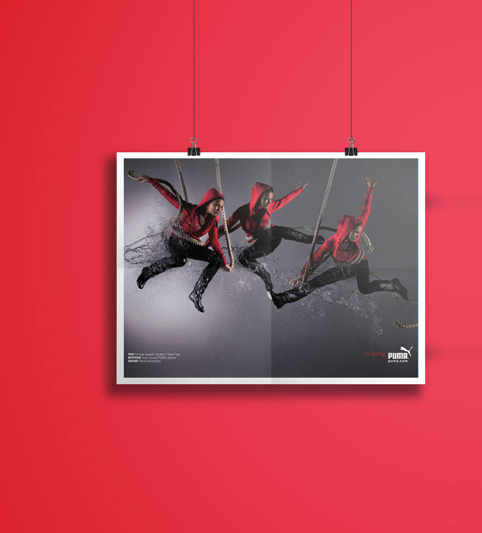 Known for portraying a collision of lifestyle fashion, color, and bodies in motion, we revealed a new advertising campaign for PUMAs popular „I‘m Going“ series. Similar to previous campaigns, the new ads express movement, athleticism, and progression. Frozen in time, the abstract scenerey adds an intensity and power to the highly composed and sophisticated images.
